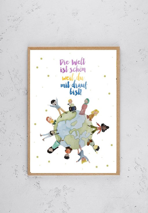 Kinderzimmer Poster DIN A4 - Die Welt ist schön, weil du mit drauf bist